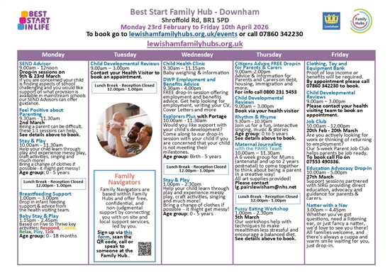 On this page you can find all the timetables for Lewisham Family Hubs.